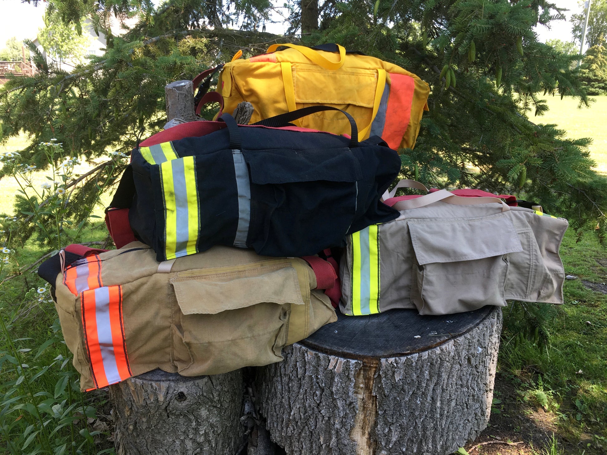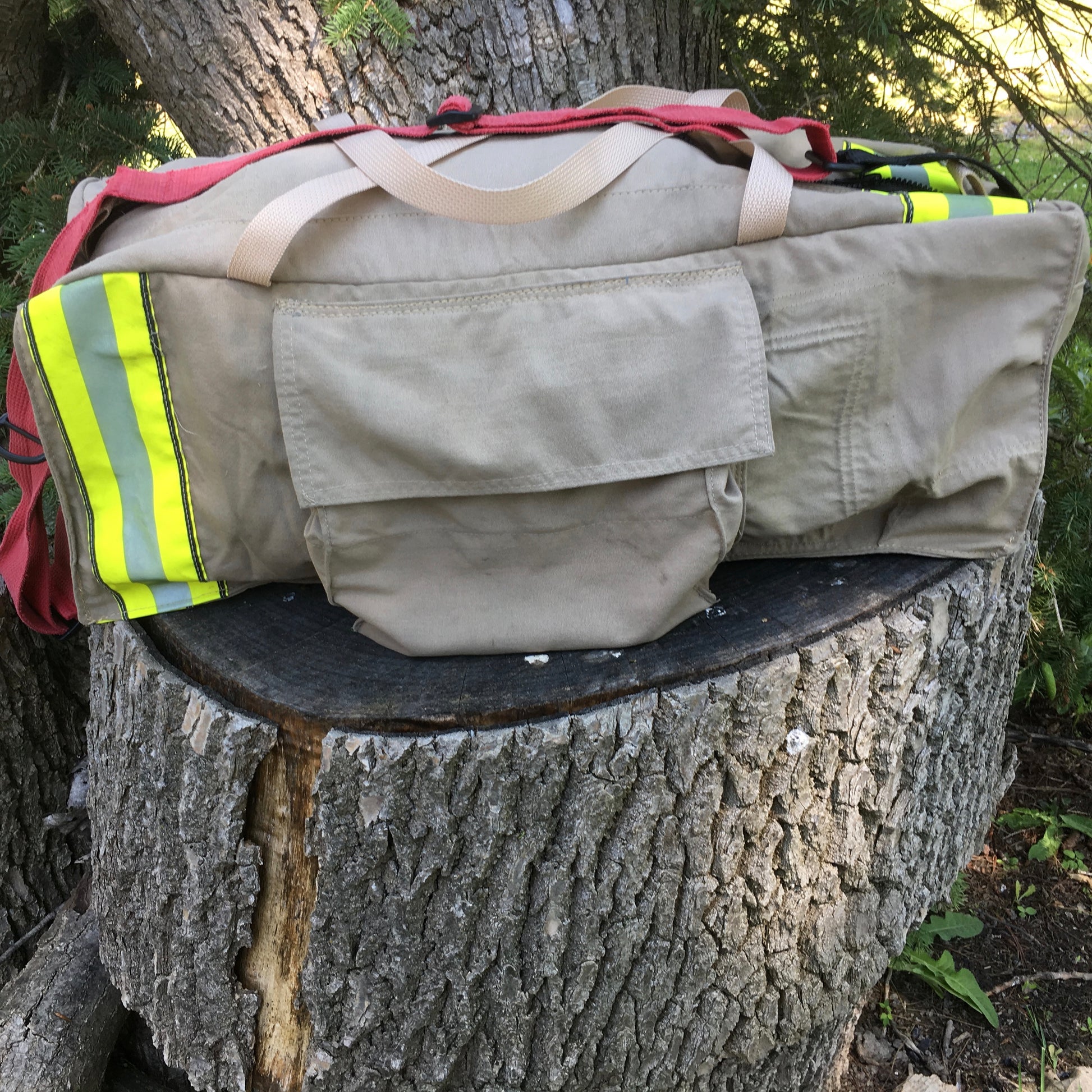 Made from recycled fire gear. 4 pockets- Flat end pocket, Larger pocket on each side, zippered closure. Web carry handles, Suspender over shoulder strap. Interior-Quilted fire gear liner with 2 flat pockets on each side.