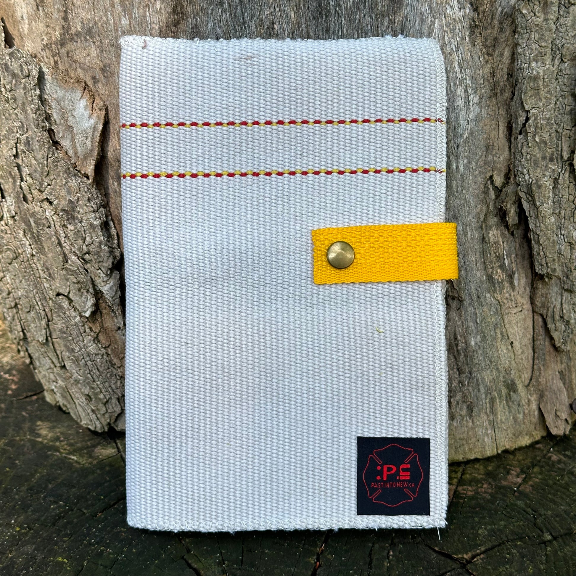 Made from recycled canvas fire hose. Snap closure and strap in interior to hold in notebook. Comes with 160 page lined notebook.