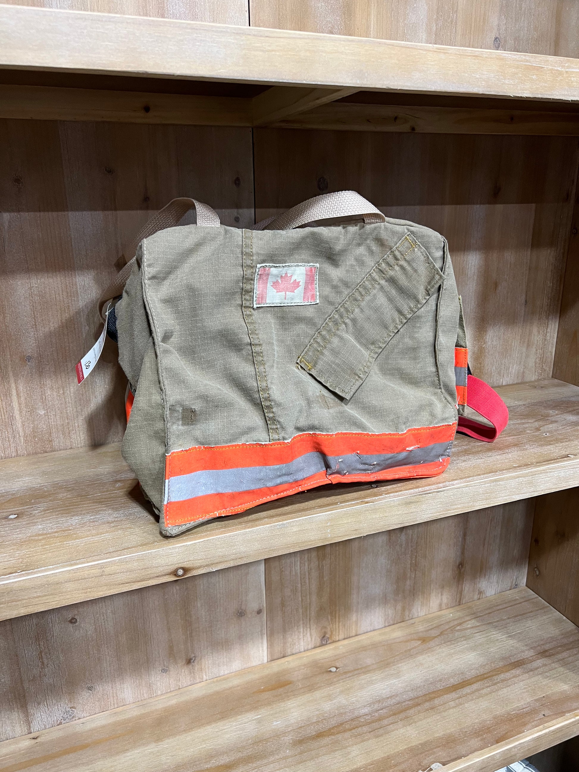 Made from recycled fire gear. Pocket on both sides, flat pocket on one end of bag with a hook on other. Web carry handle and suspender shoulder straps zipper closure.