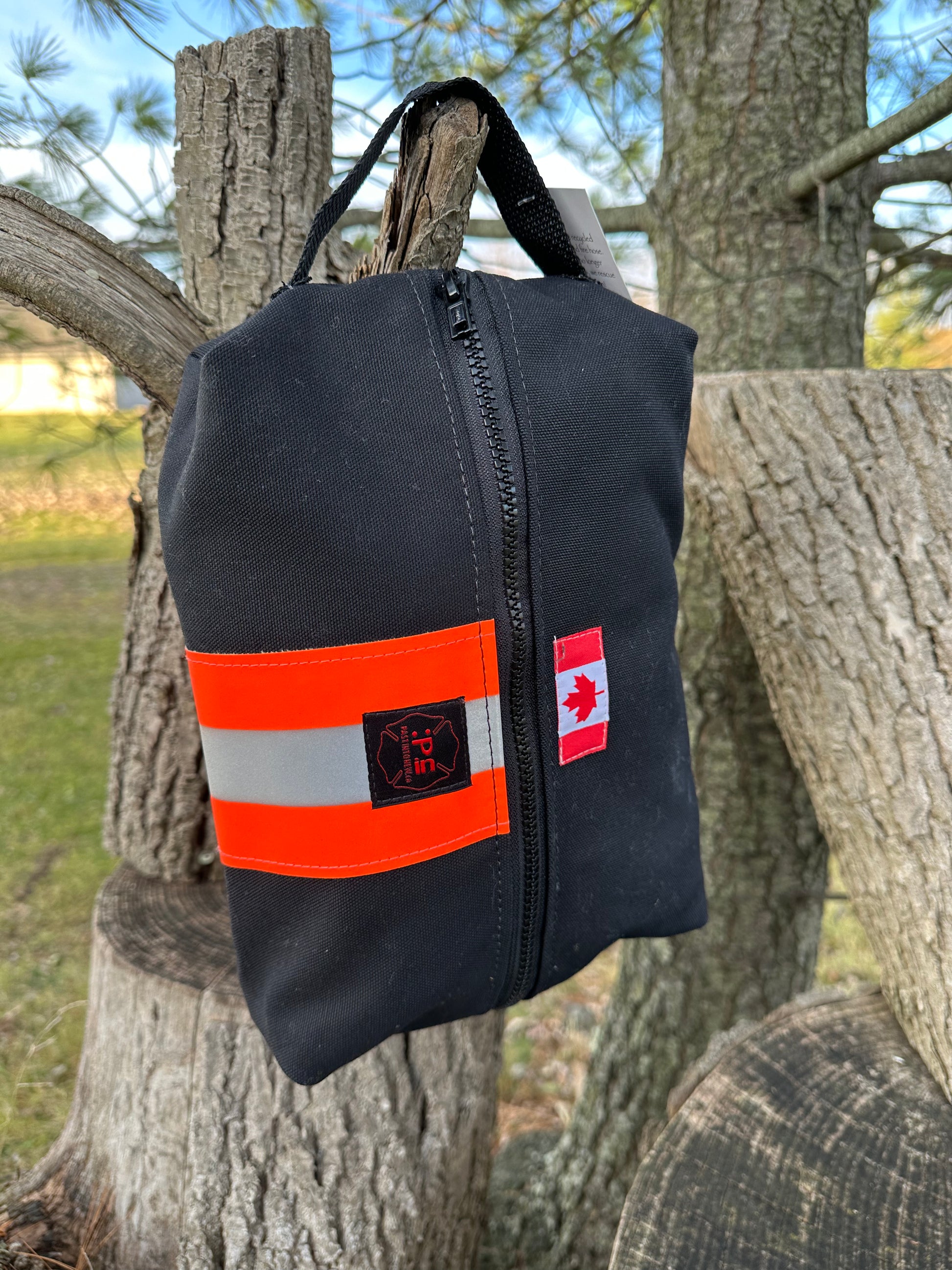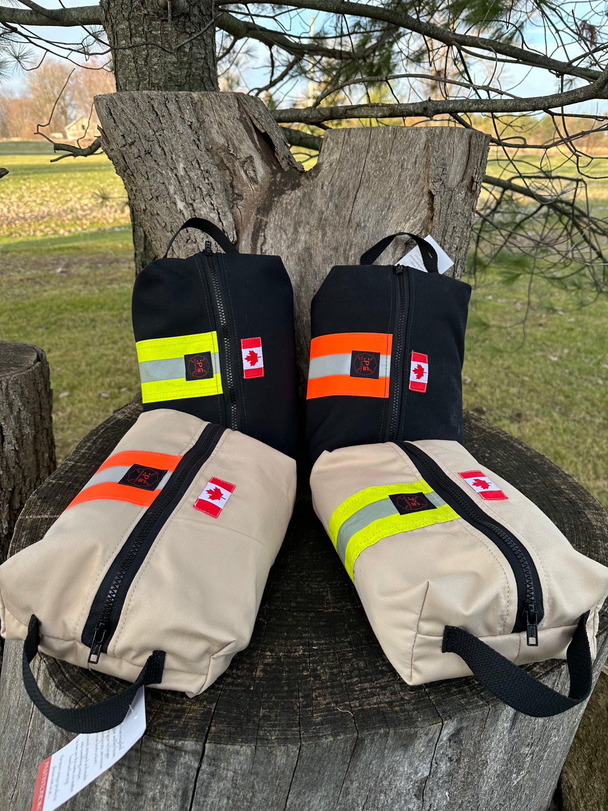 Made from recycled fire gear. Exterior of bag is fire gear, zippered closure, webbing handle, interior is vapor barrier. Lightweight and washable.